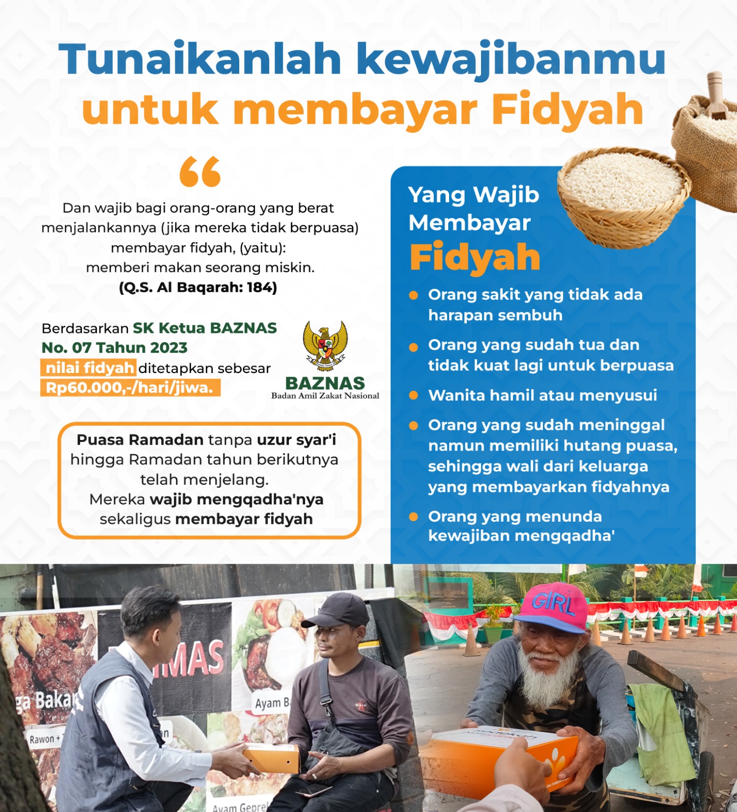 Namun, bagi muslimin yang sudah tidak mampu lagi berpuasa, Allah memberikan keringanan untuk mereka dengan adanya fidyah. Fidyah sendiri artinya adalah memberi makan kepada orang miskin sebagai ganti puasa.