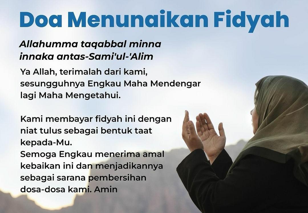 Artinya: "Aku niat mengeluarkan fidyah ini dari tanggungan keterlambatan mengqadha puasa Ramadhan, fardhu karena Allah".