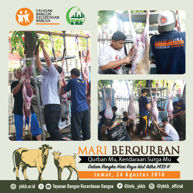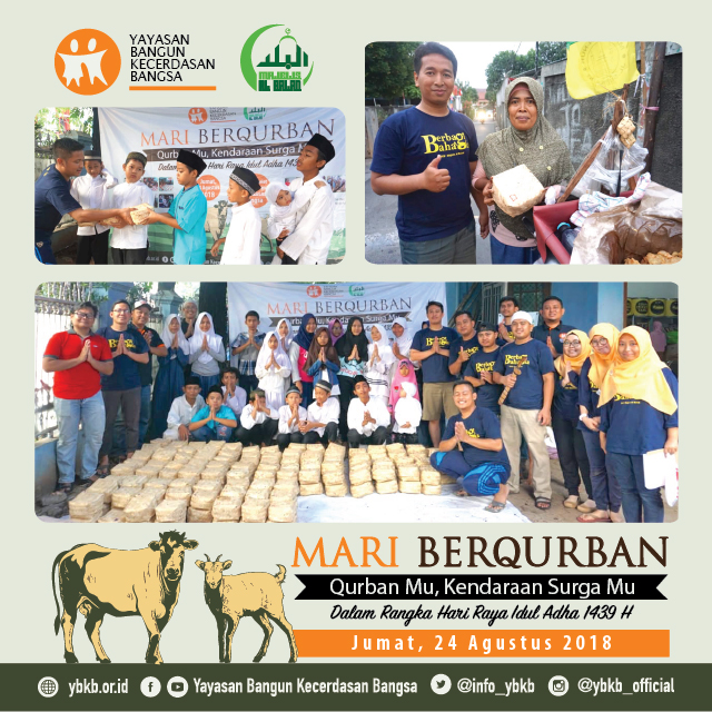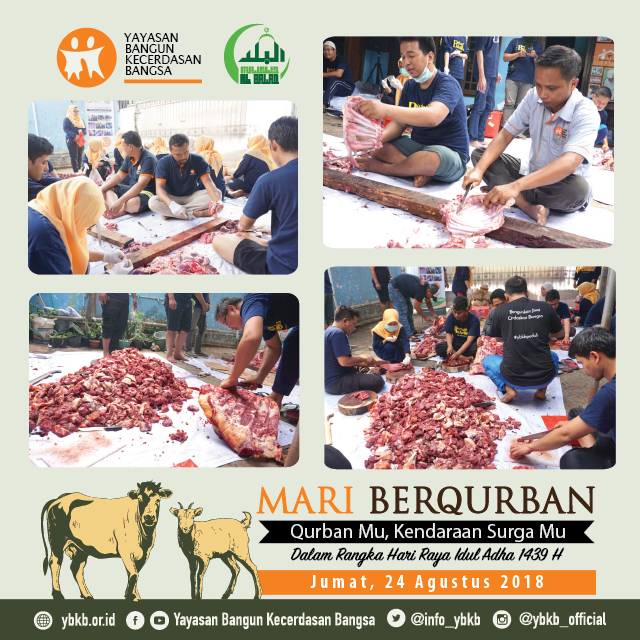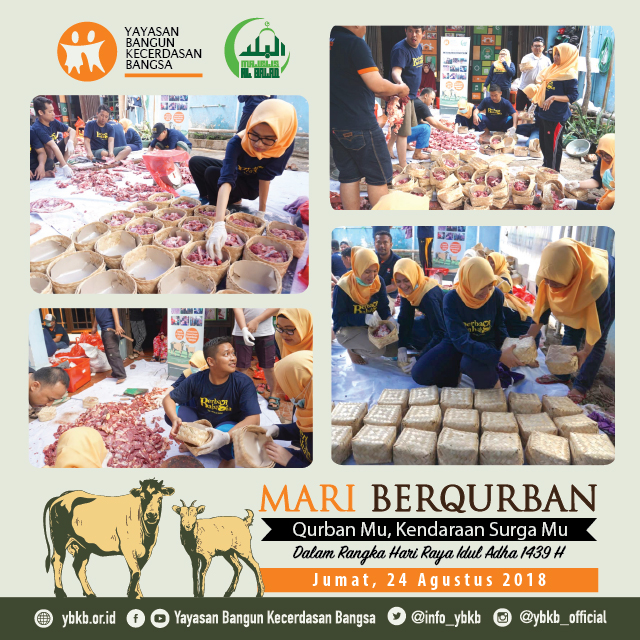 Puji syukur kepada Allah SWT. Hari Jumat, 24 Agustus 2018 telah dilaksanakan pemotongan dan penyaluran daging Hewan Qurban kepada adik-adik Yatim binaan YBKB dan juga kepada masyarakat Dhuafa di sekitar kantor YBKB di Kelurahan Gedong, Pasar Rebo, Jakarta Timur.