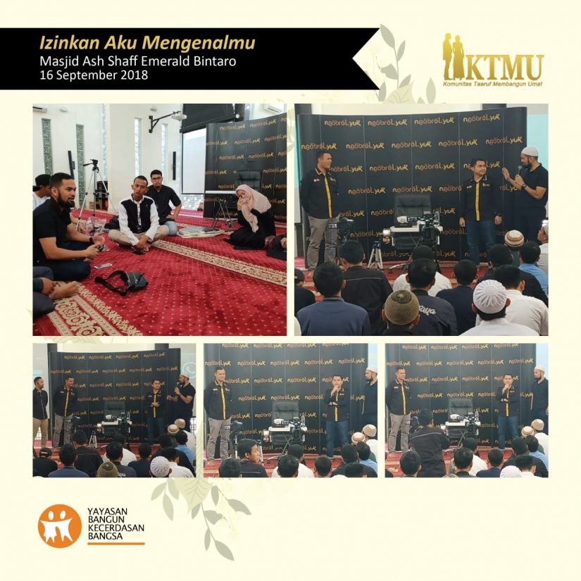 Pada Tanggal 16 September 2018 yang lalu bertempat di Masjid Ash Shaff Emerald – Bintaro sektor 9, Komunitas Taaruf Membangun Umat (KTMU) berkesempatan untuk memperkenalkan diri dan bercerita perihal KTMU dalam acara bertema “Izinkan Aku Mengenalmu” yang diadakan oleh Komunitas Ngobrol Yuk.