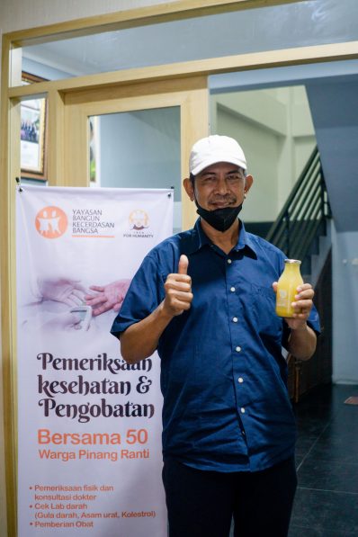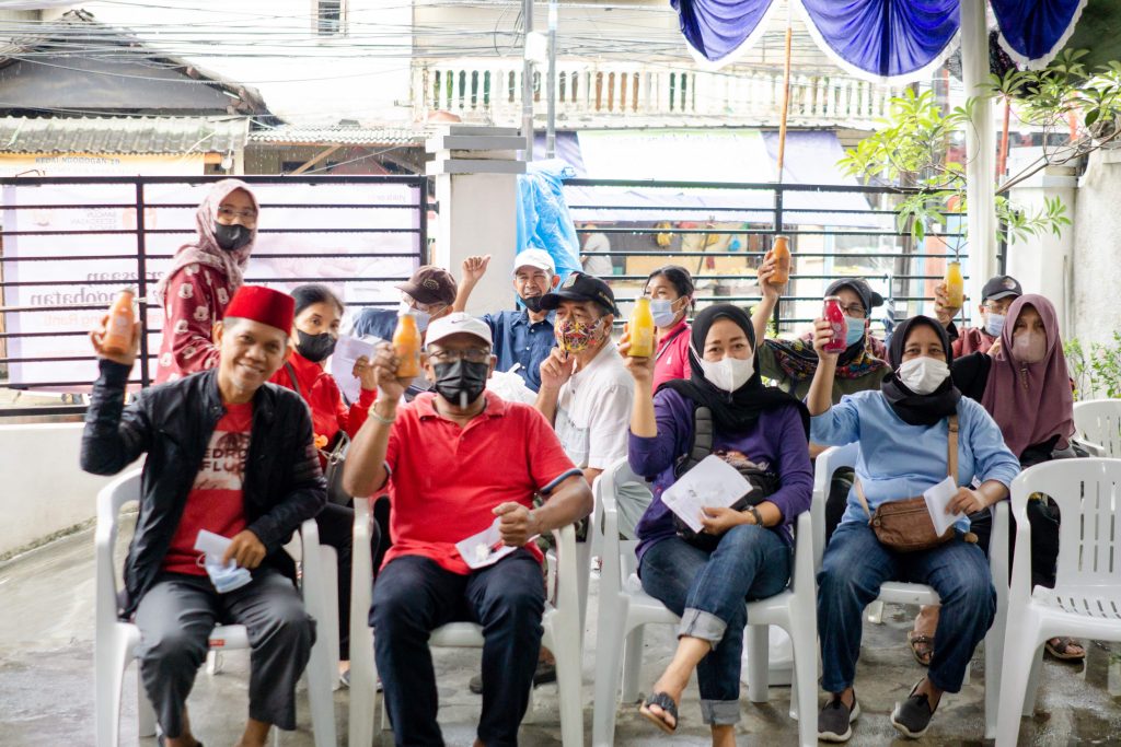 Warga Pinang Ranti yang telah mengikuti rangkaian Pemeriksaan Kesehatan mendapatkan jus dari IT’s Buah