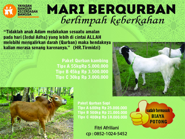 Kami dari YBKB, Insya Allah akan mengadakan pemotongan hewan Qurban dalam rangka Hari Raya Idul Adha 1437 H.
