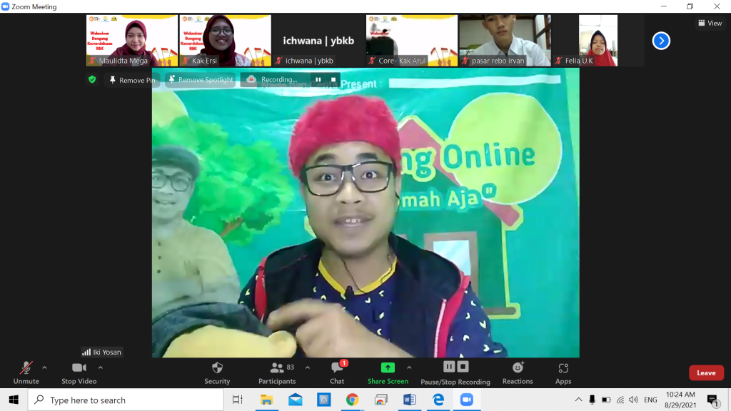 Dongeng kali ini berlangsung secara daring melalui zoom dan kegiatan dongeng ini diikuti juga oleh adik-adik dari 8 titik Rumah Belajar Kita di waktu bersamaan.
